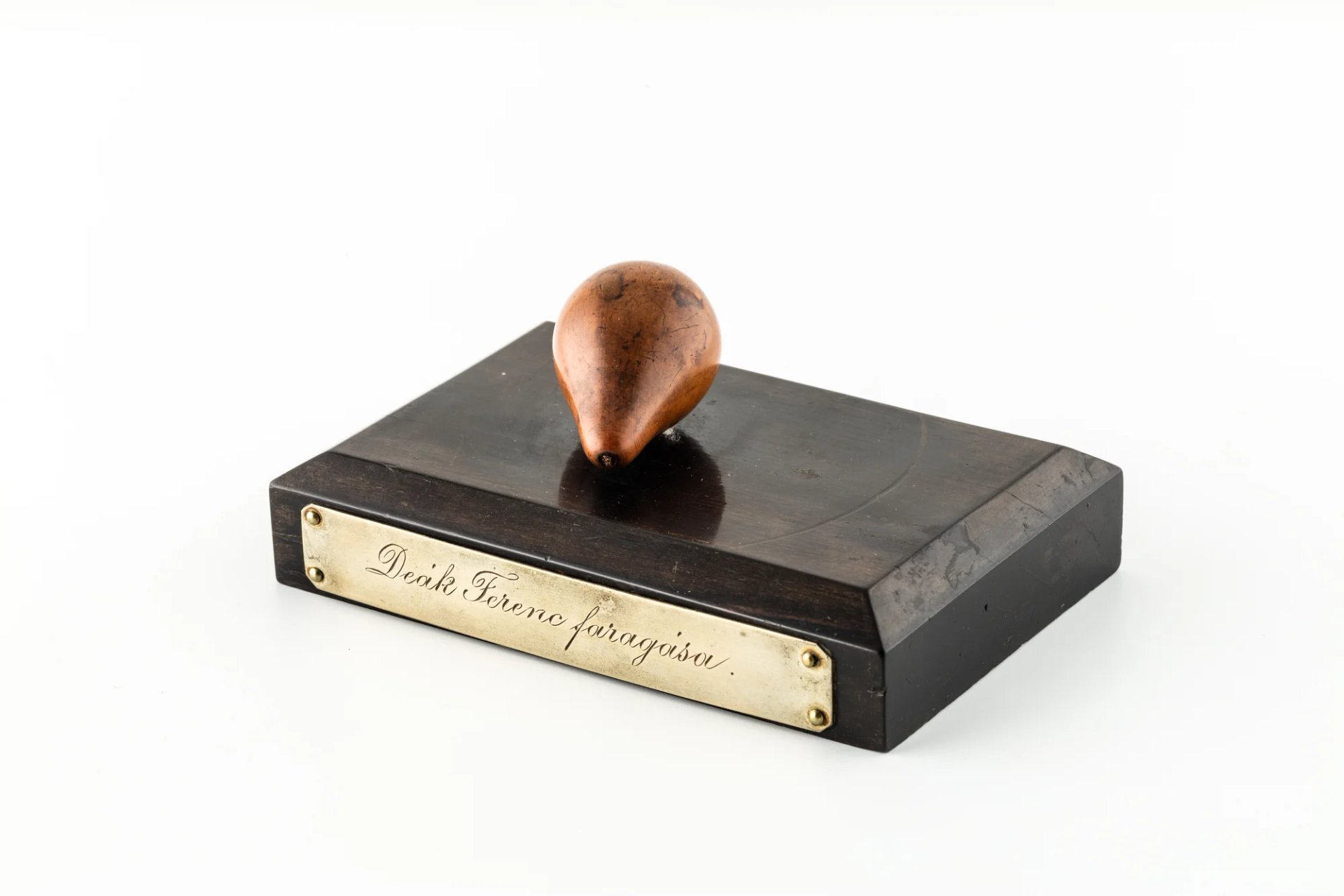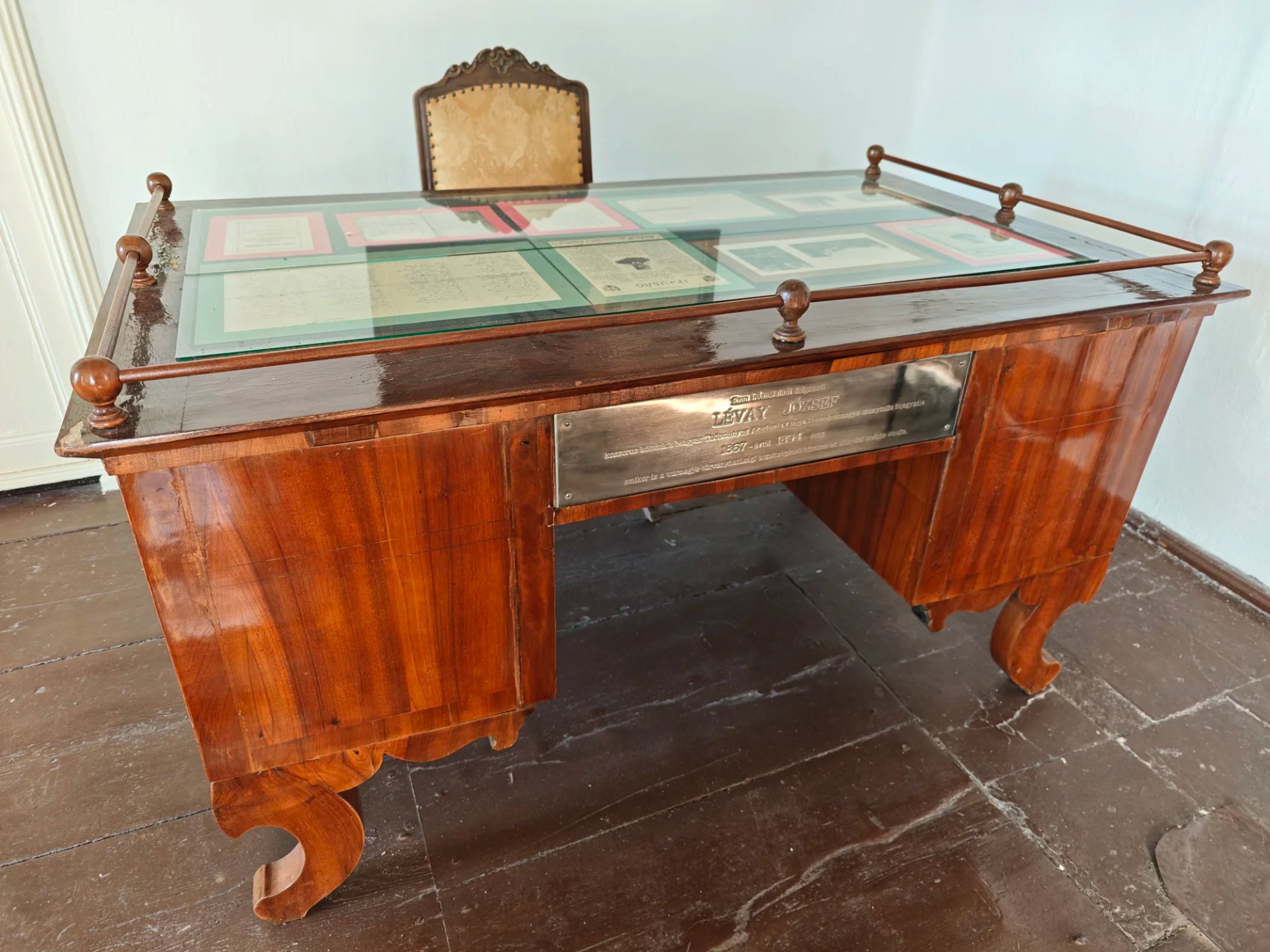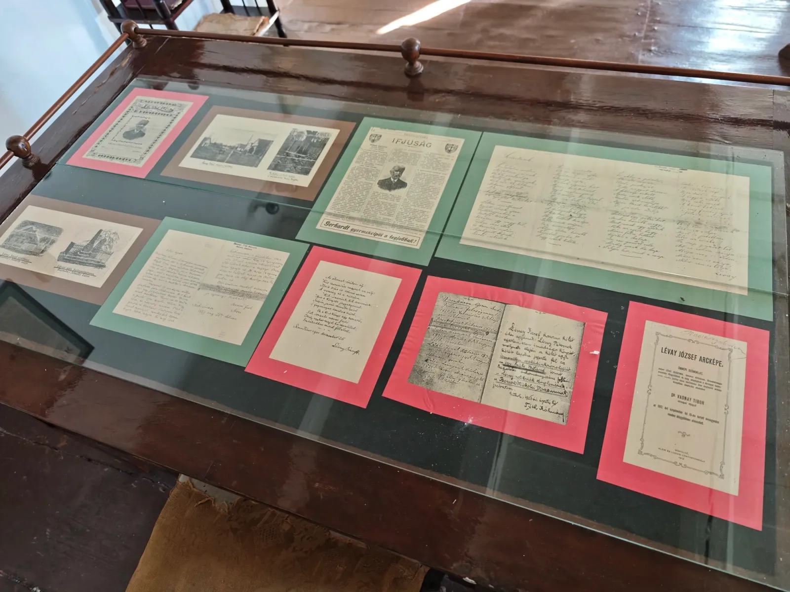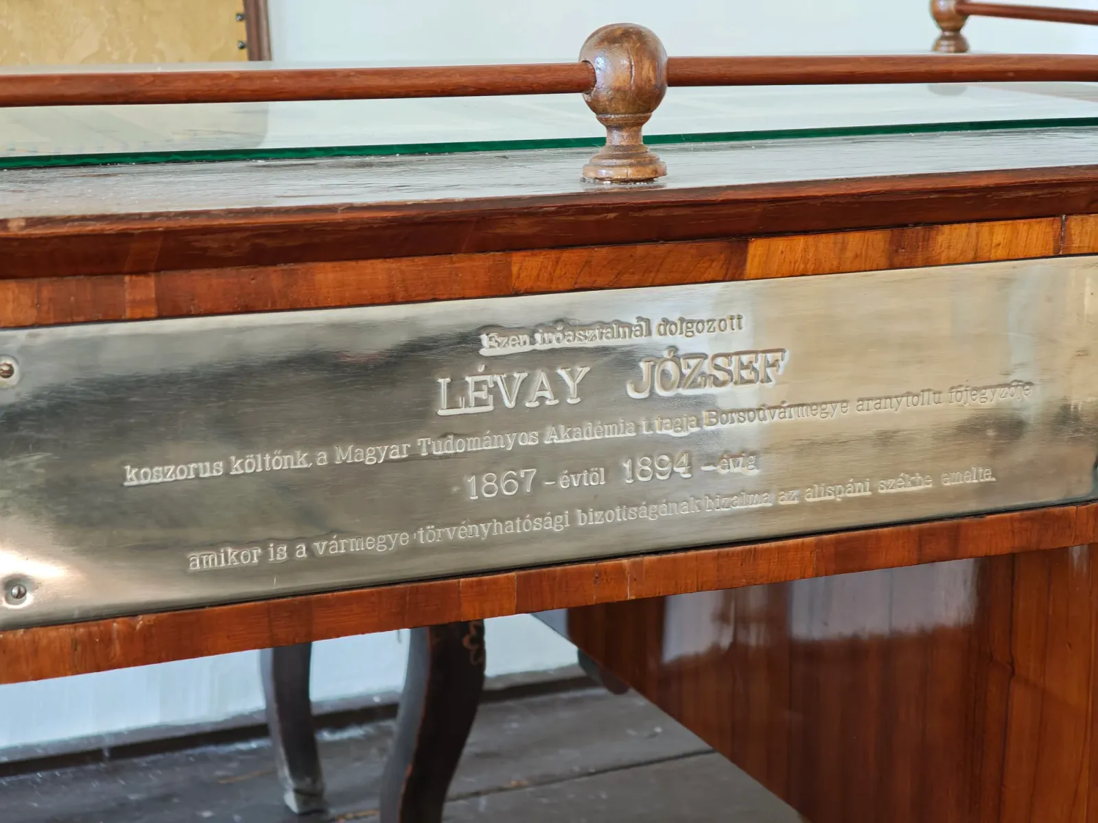 Magas támlájú, hintaszék alakú karosszék párban Szemüvegtok szemüveggel, miskolci cégjelzéssel Házi sapka barna bársonyból, aranyhímzésekkel, tetején bojttal Szárazbélyegző, kerek fatalpon, gombbal, vörösréz ütőszerkezettel, „Lévay J.” felirattal Díványpárna keresztöltéses, színes virágos díszítéssel, középen „L. J.” monogrammal, négy sarkán egy-egy bojttal, műbőr keretes Lévay József aranytolla Tollszár, eredetileg három letört – azóta elveszett – tollvéggel Ezüstkoszorú. Ruhakefe Ruhafogas, kerek talpon csavart állvány, kiálló, sugár alakú fogasokkal Levélnyomó Papírvágó díszkés áttört díszítésű sárgaréz pengével, a hiányzó nyelén eredetileg „VENEZIA” felirattal Lévay József fekete díszmagyar ruhájához tartozó dolmány (alsókabát) fekete nyitással, 7 gombbal, posztó anyagból Bronzérem Feketére festett, tál alakú levélnehezék, benne bronzpénz-utánzatokkal Itatós (tapper), tetején sárga selyemhuzattal, rajta tölgyfaág-hímzéssel; a zöld bársonyhuzat lekopott Diófa ruhásszekrény, egyajtós, faragott középrésszel, világosbarna, fényezett Lévay József halotti maszkja Gömbölyű, üveg tintatartó, zöld zománcos tetővel Otthoni íróasztal Ötfiókos, diófa furnérral borított íróasztal Lévay József tükre Szemüveg csíptetővel Papírvágó díszkés Eiffel-tornyot utánzó markolattal, domborított 1889-es évszámmal